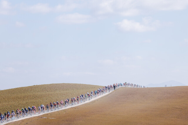 Strade Bianche, my favourite race. The peloton rides the white roads over the crest of one of many rolling hills making up the Tuscany countryside. One of my favourite photos from this season, a simple and clean photograph. It was in this field my French driver lost his keys, a