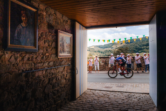 With just one category two climb left to go on Stage 12 of the Tour de France Mathieu Van der Poel was in the lead solo, after what had seemed like an unusually quiet race from the Dutch superstar I was excited for what could be a box office finish, finding this small village on google earth and it being the last place my friends and colleagues Russ, Joris and I could shoot before cutting off course to the finish we stopped and began the search to find a shot. We stumbled across a local French Artist by the name Allain Renoux (Look him up, great painter) in the midst of hosting a lunchtime party with his friends and family, invited in we had wine and cheese. I shot from in the artists house, as Van der Poel flew the party guests adorned in