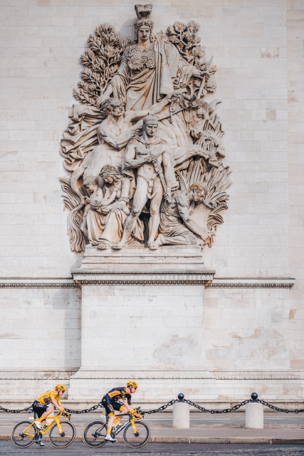 I remember after the 2022 Tour de France I was annoyed for not shooting this photo, thankfully I only had to wait a year and it delivered better than expected. To have a clean photo of Jonas Vingegaard, the Tour de France winner and his loyal lieutenant Nathan Van Hooydonck against the arch of the Arc de Triomphe, luck you could say. The finish line is a good 15 minutes walk from here, each year we wave down the broom wagon and catch a lift to the line with a handful of laps remaining, the thrill hasn’t worn off yet, riding the Tour de France broom wagon down the Champs Élysées.