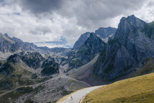 A lone rider amongst the giant mountain peaks of the Col du Tourmalet.