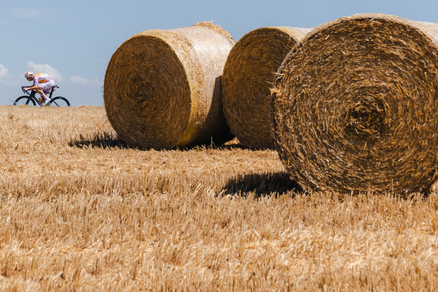 Jonas Abrahamsen riding in the Polka Dots past the iconic French hay bail scene.