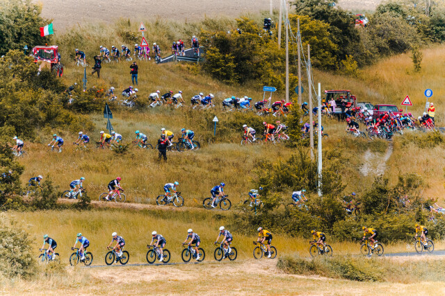 The peloton descending Cerredolo dei Coppi during stage 12 of the Giro d'Italia, I wasn't happy with the original photo I found here, I put my new policy in place, keep walking until I find the shot I like. This is the result.